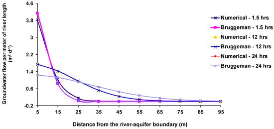Figure 6 shows the groundwater flux as a function of distance from the river at different times (1.5, 12, 24 h). It is noticed that the maximum discharges are attained within the first 1.5 h and range from 4.13 to 1.25 m2 d−1 per meter of river length for a location 5 m away from the river-aquifer boundary. The maximum difference between the numerical and Bruggeman solutions was 0.3 m2 d−1 and the RMSE was 0.0145 m at 1.5 h. The accuracy of the numerical solution is mainly determined by the space and time discretization. It is concluded that the results of the analytical solutions of Edelman [], Lockington [], and Bruggeman [] are in a good agreement with the numerical solution.