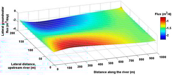 Figure 10 shows in two dimensions the lateral groundwater fluxes obtained from the STRIVE model. The fluxes are directed towards the river (values are negative); the maximum and minimum discharges from the aquifer to the river along the river are respectively 1.49 and 0.74 m3 d−1 at 900 m and 200 m viewed from the upstream boundary respectively.