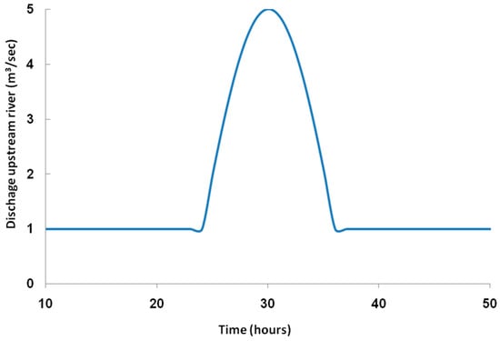 In the second case, the river boundary is based on water levels from a hydrodynamic surface water model, which is also integrated in STRIVE []. The water level in the hydrodynamic surface water model was calculated based on an upstream discharge condition, formulated as a half sine wave (Figure 11). Other boundary conditions and initial conditions are the same as those applied in case 1. The model was run in transient for a period of 30 days with a time step of 1 min and output interval of 1 h. The river boundary values in this case were obtained from the output of the hydrodynamic model.