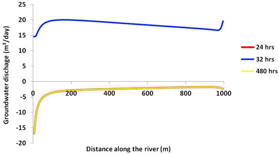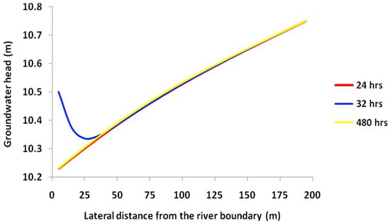 In Figure 13, the effect of the river pulse on groundwater heads at different times (24, 32, and 480 h) and at different distances along the river at 100 m (near to the upstream model boundary) are shown. At 24 and 480 h (before the beginning and after the ending of the pulse), there is no effect of the river pulse on the groundwater heads, and the flow is directed towards the river boundary. However, at 32 h, the effect of the river pulse on the groundwater heads in the model appears clearly at the edge of the river-aquifer boundary (30 m) and disappears after a distance of 30 m from the river-aquifer boundary.