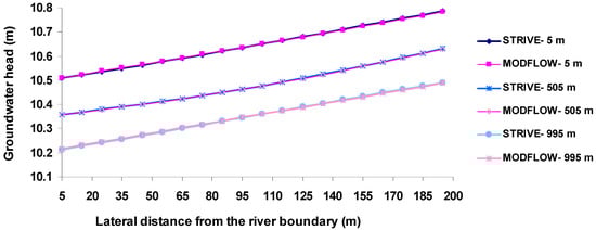 Groundwater head versus lateral distance from the river-aquifer boundary at fixed distances in the longitudinal direction of the river at 5 m (near the upstream model boundary), 505 m (at the middle of the river length), and 995 m (near the downstream model boundary), using STRIVE and MODFLOW, based on interpolated river boundary with a steady-state simulation.