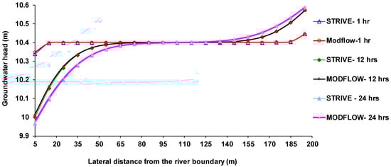 In order to see the agreement between the STRIVE and MODFLOW results, the groundwater heads in lateral direction from the river-aquifer boundary at different distances along the river at 5 m (upstream river), 505 m (the middle of the river), and 995 m (downstream river) are shown in Figure 15. Figure 16 shows the groundwater heads in lateral direction from the river-aquifer boundary at distance of 505 m along the river at different simulation times (1, 6, 12, 24 h). The maximum head difference between STRIVE and MODFLOW was 0.004 m, and the RMSE is 7.1 × 10−6 m and 1.8 × 10−5 m for steady-state and transient state simulations, respectively.