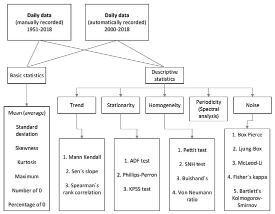 | Mann–Kendall: Kendall’s tau = −0.0025 p-value = 0.598 alpha = 0.05 NO TREND | ADF test p-value = 0.00001 alpha = 0.05 STATIONARY | Pettit test: p-value = 0.2188 alpha = 0.05 HOMOGENEOUS | 365.25 d | Box–Pierce: p-value = 0.0001 alpha = 0.05 NO NOISE |