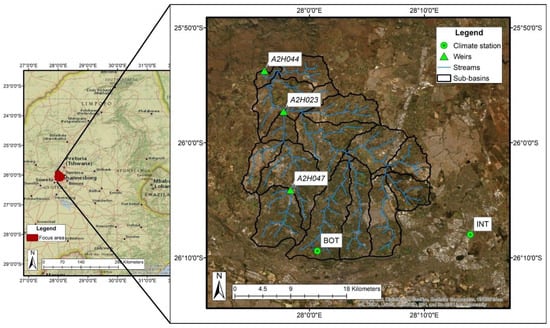 The study area with sub-basins, weirs and climate stations. The City of Johannesburg is located in the south with the capital city of South Africa, Pretoria, in the north.