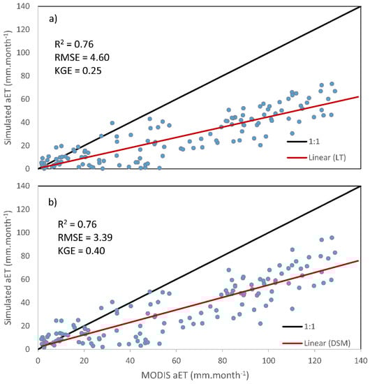 Monthly aET derived from MOD16 against simulated aET using (a) the LT soil dataset and (b) the DSM dataset for the entire basin.
