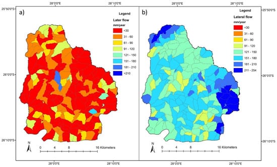 Representing the spatial distribution of dominant streamflow generation processes is vital for decision making (e.g., [,,]). Here, we showed how different soil information datasets impact the spatial representation of lateral flow generation. In Figure 6, the relative contributions of lateral flow on 230 different landscape units (LSU) are presented and they differ not only in terms of the volume of flow generated but also in terms of the spatial distribution of the relatively high- and low-generating LSUs. For decision making purposes, the spatial representation could be refined to HRU scale (2034 units). Such information can help with the planning of development projects, such as the location of subsurface drains, graveyards and the type of foundation to consider in different areas. Without detailed soil information, the importance of lateral flow in this catchment would have been underestimated, and this highlights the role that spatially distributed models can play in the design and evaluation of water management plans [].