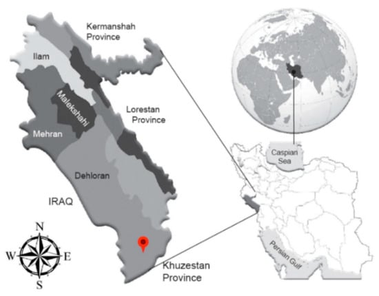 As previously mentioned, the area focused on in this study is that of the Ein Khosh Plain. This is part of the Plain lands of Dehloran city in the Ilam province in western Iran. Its area is approximately 34,500 hectares and is 90 km from Dehloran city. The latitude of the region extends from 47°33′ to 47°49′ east longitude and 32°11′ to 30°25′ north latitude. This area has the longest common border between Iran and Iraq. The average height of the area is about 137 m above sea level and the average annual temperature is 25.6 °C. The average annual rainfall is 271.5 mm, and the wet season peaks in December and January. The dry period of the region is from approximately 1 April to 1 November. A map showing the region and its location in Iran and the Middle East is provided in Figure 1.