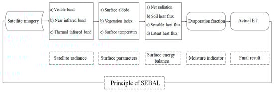 The Surface Energy Balance Algorithm for Land (SEBAL) was used to estimate the ET []. A conceptual schematic of SEBAL is presented in Figure 2.