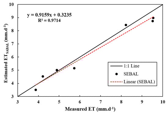 Kimura et al. [] estimated the ET in the Loess Plateau of China using satellite images and the SEBAL method. They provided comparisons of models and direct measurements. James et al. [] and Jiang et al. [] used satellite information to detect crop uniformity, vegetation percentages, and water stress and to manage irrigation systems in India, Pakistan, Sri Lanka, Argentina, and Iran. The results showed that for 85% of the cases, the parameters estimated from remote sensing corresponded to field measurements. Kosa [] studied the effect of temperature on the actual ET based on Landsat satellite imagery. The results show that the relationship between the temperature and actual evapotranspiration is in the format of the polynomial equation and that this relationship can be used to estimate actual evapotranspiration when the temperature is not known.
