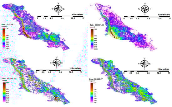where Ts is the surface temperature (°C), α is the surface albedo, and NDVI is the normalized difference in vegetation indices between −1 and +1. Values between 0 and ~0.2 correspond to bare soil or very sparse vegetation, and NDVI > 0.2 for vegetated regions. If the NDVI value is less than zero, the surface is assumed to be water and G/Rn = 0.5. For areas where Ts < 4 °C and α > 0.45, it is assumed to be snow-covered and G/Rn = 0.5 (Allen et al. []). NDVI was calculated from Equation (8):