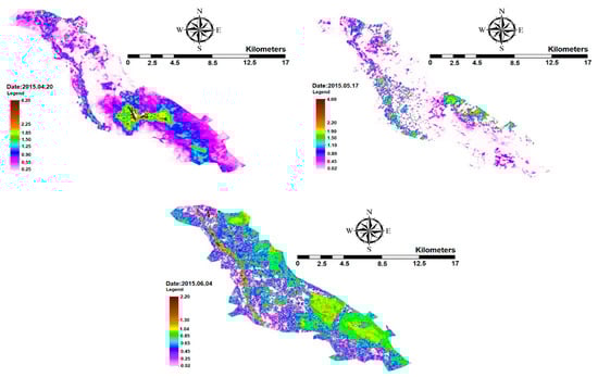 As is shown in Table 3 and Figure 4, the values of RMSE, MAPE, and MBE were 0.466, 2.9%, and 0.222 mm/day, respectively, with a correlation coefficient of 0.97, indicating that SEBAL’s accuracy is sufficient for estimating the actual ET. It can be seen that remote sensing is an efficient and effective way to estimate ET on large scales, especially in areas where meteorological data is not available. The actual daily ET rates in the Ein Khosh Plain for different months are shown in Figure 5.