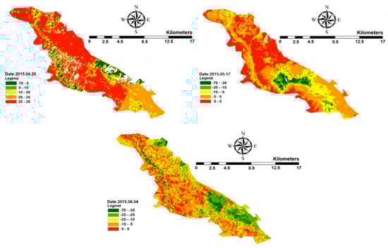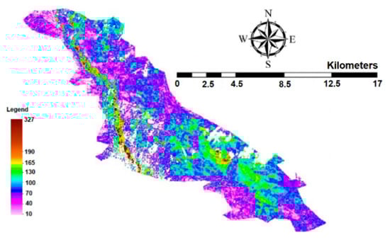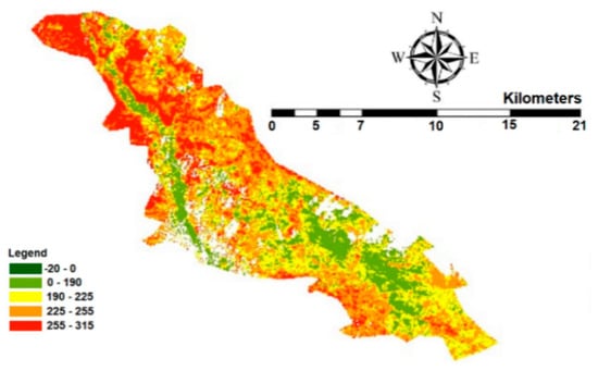 The evaluation of ET in the Ein Khosh Plain shows that the 121 mm average ET is related to agricultural lands. The total area of the plain is 363.11 km2. Taking into account the area of the Ein Khosh Plain and the cultivated land, the cultivation density is 17.21%. The normalized difference vegetation index (NDVI) was calculated according to Equation (7) and is shown in Figure 8.