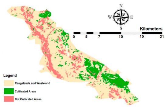 In order to estimate the water requirement of the Ein Khosh Plain, the study areas were classified into three categories: cultivated, not cultivated/fallow, and rangeland/wasteland. Images were classified using an object-oriented method and eCognation software was employed. Each image was classified within the software based on a threshold value. Image segmentation was performed in order to subdivide the overall image into multiple non-overlapping parts (Zoleikani et al. []). An example outcome of this process is provided in Figure 7.