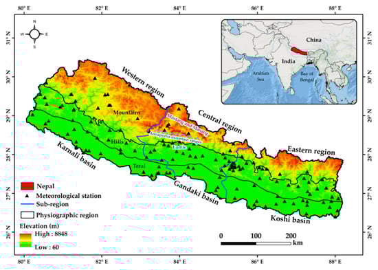 The study area includes the southern slopes of central Himalaya, Nepal. The lowlands (~60 m) in the south to the high Himalayas (up to 8848 m) in the north represent varying landscapes, topography, weather, and vegetation within a small width (average ~192 km) of the country (Figure 1). Nepal is broadly divided into three Ecological zones, named as Terai (Lowland areas), hills, and mountains. The wettest (Lumle) and driest (Mustang and Manang) areas of Nepal are located in the Gandaki river basin. These areas explain how the topography mediates the precipitation distribution, i.e., being located in the windward (Lumle) and leeward (Manang and Mustang) side of the Annapurna mountain ranges [9,36]. The Eastern, Central and Western regions are divided based on three major river basins, namely, Koshi, Gandaki, and Karnali, respectively. Furthermore, the South Asian monsoon and Western disturbances determine the climatology and distribution of the precipitation in Nepal. South Asian monsoon brings widespread precipitation from June to September through the Bay of Bengal, with higher amounts in the Central region than Eastern and Western regions [8,35]. Western disturbances bring precipitation from December to February, which are eastward-moving air currents in mid-latitudes that enter the Western region of Nepal passing through Iran, Afghanistan, Pakistan, and northwest India [37,38]. The average annual precipitation during 1982–2015 in Nepal is 1428 mm [39].