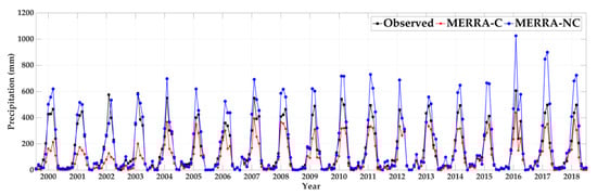 Monthly precipitation time-series (mm) from observed, MERRA-C, MERRA-NC average over Nepal during 2000–2018.