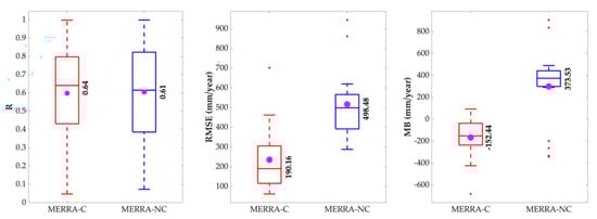 Additionally, boxplots of the annual performance metrics (R, RMSE, MB) for MERRA-2 product and observation are presented in Figure 3. These metrics were generated by comparing point data for interannual timescale. MERRA-C datasets show the median R, RRMSE and MB of 0.64, 190.16 mm/year and −152.44 mm/year, respectively. As similar to Figure A1, the model-only MERRA-NC overestimated the annual precipitation amount with a larger error as indicated by higher RMSE values than MERRA-C. Overall, MERRA-C depicts a slightly high median of R-value; however, the difference is nominal.
