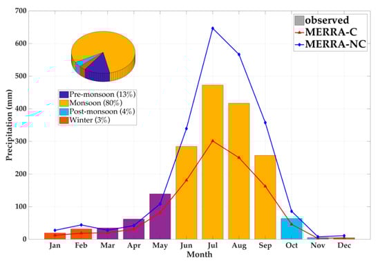 The average seasonal cycle of precipitation during the study period shows the peak precipitation from June to September. MERRA-C and MERRA-NC underestimated and overestimated the observed seasonal cycle of precipitation, respectively. However, MERRA-C and MERRA-NC can reproduce the overall precipitation pattern, but the accuracy is poor in the wettest months for both MERRA-2 datasets.
