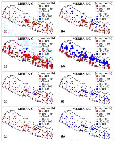 Spatial distribution of mean bias (MB) at each station in MERRA-C and MERRA-NC for a different season, (a,b) pre-monsoon, (c,d) summer monsoon, (e,f) post-monsoon, and (g,h) winter, respectively. Red and blue circles represent the underestimated and overestimated of precipitation amount across the country, respectively.