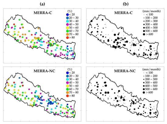 Figure 7 shows the spatial distribution of correlation coefficient (R) and RMSE in summer monsoon for both MERRA-2 datasets at each station during the study period (2000–2018). The previous result shows that the large error occurs during the monsoon season (Table 2 and Figure 6) at most of the stations across the country. Both of these MERRA-2 datasets showed a very similar correlation at most of the station, although MERRA-C achieves a slightly higher correlation value at mid-elevation areas of the central region (Figure 7a). MERRA-C showed the larger RMSE (>400 mm/month) at most of the station located at high precipitation areas (central region), while MERRA-NC showed large RMSE at most of the station over mid- and high elevation areas of central and western region (Figure 7b). It is possible that the systematic error in MERRA-C was reduced from MERRA-NC due to bias correction, but the random error might be the same in both the datasets. Hence, the results of comparison over these mountainous regions are uncertain, indicating complex terrain lead to higher uncertainty in rainfall estimates over these regions.