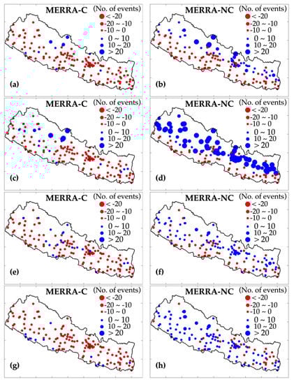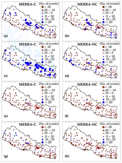 The bias distribution of very wet (R95p) and very dry (R5p) precipitation events in both MERRA-2 datasets was calculated for different seasons. Figure 8 shows the spatial distribution of bias in the total frequency of R95p at each station across the country. Both datasets show the large positive bias (>10 events) at high-elevation areas of the country during the pre-monsoon (Figure 8a,b). In the monsoon season, MERRA-NC largely overestimated (>20 events) at most of the stations in mid-and high-elevation areas, whereas MERRA-C shows more consistent performance with smaller bias (<−10 events) at most of the stations (Figure 8c,d). For post-monsoon and winter season, MERRA-NC overestimated, and MERRA-C underestimated the total frequency of very wet events (Figure 8e–h). Overall, MERRA-NC shows large positive bias and tends to overestimate the frequency of very wet events, while MERRA-C shows more consistent performance to reproduce the very wet events (smaller bias) across the country.