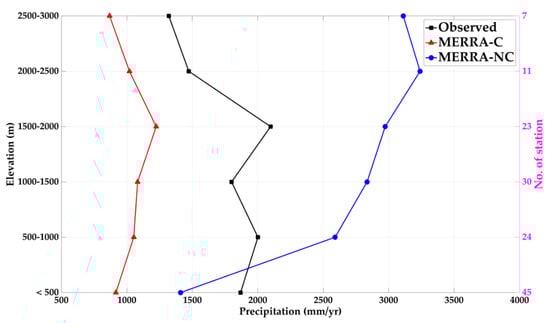 Mean annual precipitation in observed and MERRA-2 datasets at different elevation range with a respective number of the station during the study period.