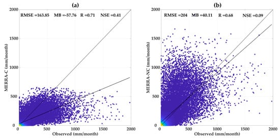 Scatterplot between observed, (a) MERRA-C, and (b) MERRA-NC generated by monthly datasets at all stations between 2000 and 2018 across the study area. The unit of the figure metrics is in mm/month.