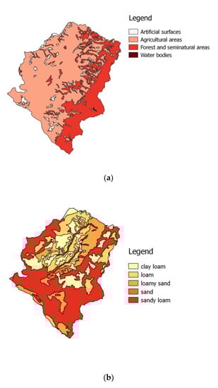 (a) Maps of land use (from Corine Land Cover, 2007) and (b) texture (ARSSA Calabria–Regional Agency for Development and Services in Agriculture, 2003) of the Mesima torrent (Calabria, Southern Italy).