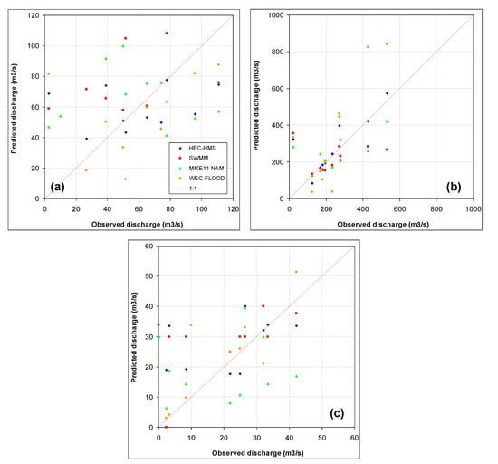 By a visual comparison, the mean, minimum and maximum values of the observed versus predicted discharges appear quite scattered compared to the identity line (prediction equal to the observation) as shown in Figure 4. The maximum value of the discharges predicted using the HEC-HMS software, which lined up quite well along the 1:1 l (Figure 4b) is an exception.