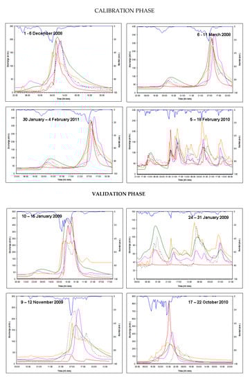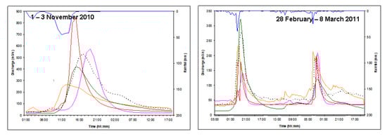 WEC-FLOOD was calibrated by setting up the input parameters related to water loss after rainfall. The Horton method was used as the infiltration model, increasing the parameters of the infiltration curve from zero infiltration to the optimal values. The initial infiltration was between 4.3 (event of 5–18 February 2010) and 6.8 (1–6 December 2008) mm/h, while the final value was in the range of 3.3 (6–11 March 2010) and 4.7 (1–6 December 2008) mm/h. The decaying rate was set to 0.65 for the event of 6–11 March 2008) and 0.75 h−1 (1–6 December 2008 and 5–18 February 2010). For the event of 30 January–4 February 2011, all these input parameters had to be set to zero, otherwise the model would not have produced runoff.