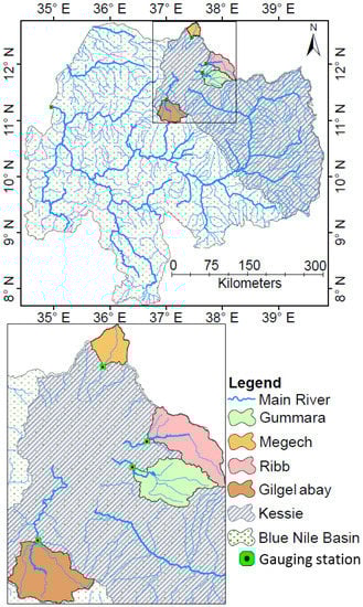 Location map of the study area (top). The bottom map shows the small-scale basins with high resolution. Six streamflow gauging stations, namely, Gilgel Abay, Gummara, Ribb, Megech, Kessie and Eldiem, were considered in this study to investigate the robust probability distribution function.