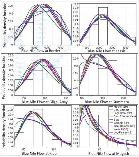The most commonly used probability distribution functions (Table 2) are applied at the selected six representative gauging stations in the Upper Blue Nile River Basin. The candidate probability distribution functions are: extreme value type-II (Frechet, EV2), the three parameter gamma (GM3P), generalized gamma (GMG), generalized extreme value (GEV), beta (BT), the four parameter generalized gamma (GMG4P), Log-Pearson type-III (LP3), the three parameter lognormal (LN3P), and the three parameter Weibull (WB3P) probability distributions.