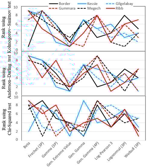 Plot shows the rank of each probability distribution function computed with three goodness of fit test statistics at all selected gauging stations in the Blue Nile River Basin.