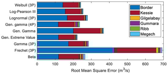 This study further compared the performances of the candidate probability distributions using the RMSE to support the results with the three goodness of fit test statistics. Figure 5 presents the stacked bar plots of the RMSE for each probability distribution evaluated at six gauging stations. Again, the generalized extreme value distribution proved to be the best distribution to predict the flood quantiles in all spatial scales considered in this study. The generalized extreme value distribution improved the flood quantile prediction performances obtained by the Frechet (3P), generalized gamma, gamma (3P), lognormal (3P), beta, Log-Pearson 3, Webull (3P), and generalized gamma (4P) probability distributions, respectively, by 67.91%, 39.64%, 22.01%, 20.41%, 16.18%, 12.81%, 8.15%, and 5.84%. The largest cumulative RMSE was observed with the frechet (3P) with value reaches ~691.62 m3/s, while the minimum cumulative RMSE (second to the generalized extreme value distribution) was observed with the generalized gamma (4P) with values of ~235 m3/s. In general, based on the overall results, it can be concluded that the generalized extreme value distribution can be considered as the robust probability distribution function for flood frequency analysis in the Blue Nile River Basin.