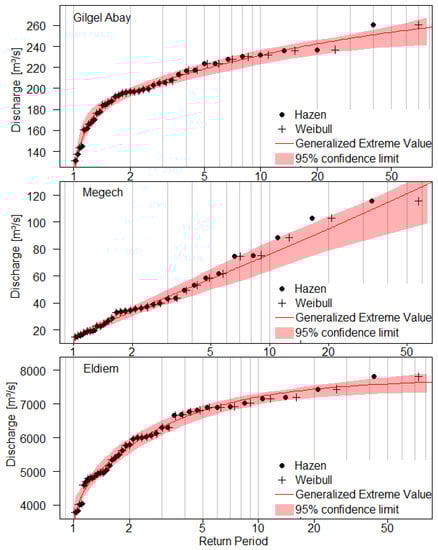 The flood frequency curves with 95% confidence limits for Gilgel Abay (top), Megech (middle), and Eldiem (bottom) gauging stations.