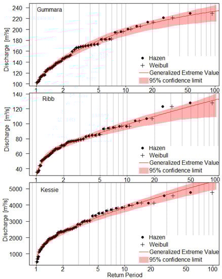 The flood frequency curves with 95% confidence limits for Gummara (top), Ribb (middle), and Kessie (bottom) gauging stations.
