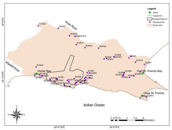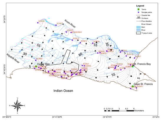 The sustainable development of water resources necessitates a thorough understanding of the hydrology of the catchment, including the groundwater dynamics in the aquifer system. This requires a vast amount of data and information about the various aspects of groundwater occurrence, circulation, storage and quality within the system []. Additionally, the accurate management and sustainable utilization of water resources, particularly in semi-arid and arid regions could be achieved through sound understanding of hydrogeology of an area, which includes the quality and quantity of both groundwater and surface water resources, besides their inter-relationships []. The study area has been identified as a potential site for the establishment of a nuclear power plant. Like many other regions in South Africa, the study area has groundwater resource potential that supports domestic and agricultural activities [,]. Therefore, it is of paramount importance to conceptualize the coastal aquifer, due to the fact that large number of communities depend on the groundwater resource for their day to day activities. Understanding of the hydrogeological processes could help to manage the aquifer, both in terms of quantity and quality. This is beneficial from an environmental regulatory point of view, since conceptual models are crucial tools for assessing the impact of environmental pollution, as well as in the analyses of the safety of toxic metal industries such as nuclear power plants []. Conceptual models provide important input to conduct 3-D numerical groundwater flow modelling. Conceptual models are key for evaluating environmental impacts and in the safety analyses of nuclear power plants []. Hence, an understanding of hydrogeological processes helps to minimize the environmental effects during the normal operation and accidental circumstances of nuclear power stations.