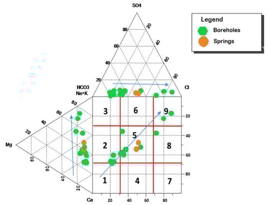 The variation in the chemical composition of water in the area could be linked to mineral dissolution, due to water−rock interaction and the mixing of different water types (Figure 8). Groundwaters sampled from the Algoa Group aquifers fall within field 2 of the Durov diagram (see Figure 8), which is dominated by Ca2+ and HCO3−. Moreover, the majority of the groundwater in the Algoa Group aquifers plot within field 5, where no particular cation or anion dominant, signifying the prevalence of mixed water in the aquifer. Furthermore, the groundwater with mixing signatures were sampled closer to the coast, thereby signifying the convergence and subsequent mixing of different flow systems along the groundwater flow direction. Similarly, the hydrochemical behaviour of most springs in the area is as a result of mixing of hydrochemically different waters (shallow water and deep circulating old water). Groundwater from the fractured TMG aquifers plot within field 9, which represents the dominance of Na+ and Cl−.