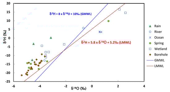 Environmental stable isotope (δ18O and δ²H) plot for surface water and groundwater samples.