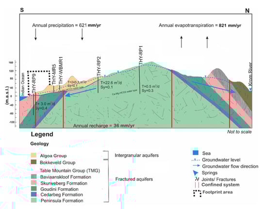 Hydrogeological conceptual model for the Thyspunt area, based on a south−north cross-section direction, as indicated in Figure 3.