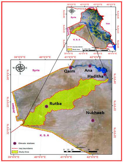 The Wadi Horan is the main wadi in the West Desert of Iraq. It represents the main wadi that receives a large amount of rainfall during the rainy season. Beginning at the Saudi border, the wadi extends from the Jordanian border in the southwest to the Syrian border in the northwest. The Wadi Horan is located south of the Euphrates River, with the coordinates 32°10′44″ to 34°11′00″ North, 39°20′00″ to 42°30′00″ East, as shown in Figure 1. An important characteristic of the rainfall regime in the study area, which is usually common for all arid regions, is a high variability of rainfall recorded from year to year and from region to region.