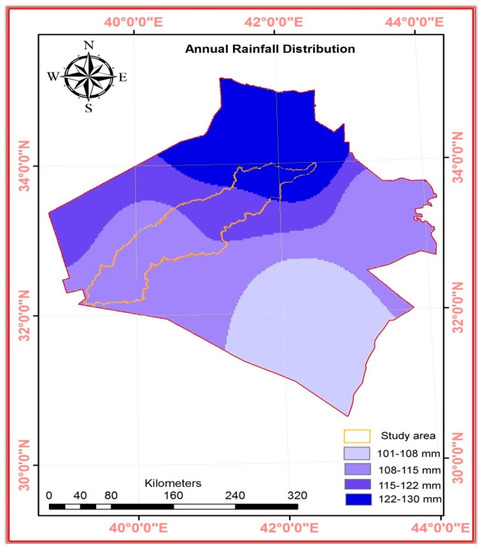The spatial distribution of the average annual rainfall, as shown in Figure 2, indicates the lowest rainfall (below 115 mm) recorded in the south-west region of the study area. With this rainfall distribution, it is worth mentioning that, in spite of the increasing altitude from east to west in the area considered, the rate of rainfall does not increase, owing to its entrance into a purely desert area [2]. In the eastern part of this area, the rate of rainfall increases from south to north. The rainy season takes place from winter to spring (October to May), while the dry season occurs in summer (June to September). The average annual rainfall for this catchment is 115 mm, with 49.5% occurring in winter, 36.3% in spring, and 14.2% in fall [5].
