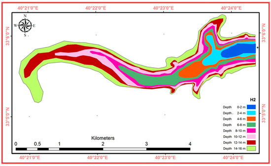 GIS integration was used to develop thematic maps of area–volume curves with Digital elevation model (DEM) extracted from Shuttle Radar Topographic Mission (SRTM), as shown in Figure 3. This Figure shows the different layers in the final thematic map, which represents water levels at different depths for one site selected in the study area. For every two meters, the area and volume were calculated using ArcGIS software with the spatial analyst model. From the area of the reservoir and the depth of water at each point, the storage of water was calculated (assuming the water level reached the top of the dam). Evaporation losses might be extremely high and will increase with an increasing surface area of the stored water. Therefore, the optimal dam heights with maximum storage of water and minimum surface area of reservoir are required, especially in arid regions with high evaporation losses. In addition, the capacity of the reservoir that can be estimated by computing the surface area and reservoir depth at any level is a vital concern in reservoir operation and management.