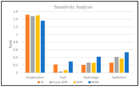 For all methods, evaporation was more effective than other indicators, as shown in Figure 5. The “Eva” criterion showed significant effectiveness in AHP (68%), fuzzy-AHP (67%), ROM (52%), and VI (69%). These results reflect the nature of the arid study area where evaporation was the major issue. The “Sed” criterion gave less effectiveness than “Eva” were the values were 17% for AHP, 19% for fuzzy-AHP, 21% for ROM, and 12% for VI. Meanwhile, the “Hyd” criterion gave the effectiveness of 12% for AHP, 12% for fuzzy-AHP, 16% for ROM, and 9% for VI. Although the AHP and fuzzy-AHP approaches gave the “Ben” criterion weights of 20% and 24%, respectively, these methods provided less effectiveness for the “Ben” criterion in the ranking process—3% and 2%, respectively. This is because the criticality may cause a major change in the final solution. As shown in Table 7, the difference between the best value and value per site for "Ben” criterion will have a small standard deviation or variance, as compared to “Hyd” and the “Eva", and therefore, it has more effectiveness for the “Ben” criterion in the ranking process for the VI method and less effectiveness in the AHP and fuzzy-AHP approaches for the ranking process. The ROM and VI methods affected the ranking priority and considered all the criteria that were sensitive in affecting the different levels in the ranking process, as compared to the AHP and fuzzy-AHP methods. Therefore, the statistical method was the most appropriate method for the study criteria that were sensitive in affecting the different levels in the ranking process, compared to the AHP and fuzzy-AHP methods. Therefore, the statistical method is the most appropriate method for this study.
