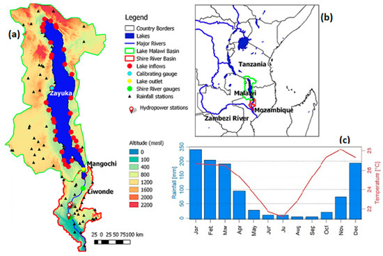 (a) The Lake Malawi and Shire River Basins, (b) their location in the Great Rift Valley in southeastern Africa and (c) the mean annual cycles of precipitation and temperature in the study area.