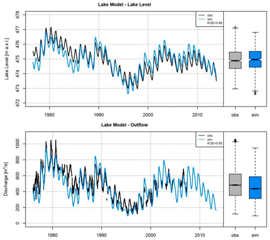 The lake model, developed for this study and linked between the ULMBM and SRM, is tested for the periods 1976–2013 (lake level) and 1976–2008 (lake outflow) (Figure 5). The model represents the observations regarding both lake level and outflow considerably well, though there are occasional non-systematic mismatches where the model either overestimates or underestimates observations. The KGE estimates are 0.86 and 0.85 for lake level and outflow, respectively. The model’s simulated lake level matches well with observations (474.9 vs. 475 m a.s.l.), where the difference is only 10 cm, while the comparison between simulated and observed lake outflow is +2.8% (487.2 vs. 473.9 m3/s). In addition to the KGE, the boxplots in Figure 5 show that the model represents the distribution of lake dynamics satisfactorily. Lake level simulations are slightly better than lake outflow simulations, which are slightly underestimated by the model.