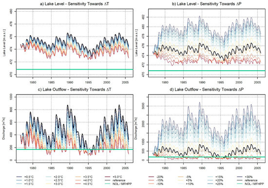 The sensitivity of lake level (a,b) and outflow (c,d) to systematical changes in temperature with constant Po (column 1) and precipitation with constant To (column 2) based on Equations (8) and (9). Green lines in a and b mark the effective lake level of 470.8 m a.s.l. (i.e., No Outflow Level, NOL), while in c and d, green lines mark the flow required for maximum hydropower generation (170 m3/s) (i.e., Maximum Flow For Hydropower Productivity, MFHPP). Black curves in each plot mark the reference simulations (i.e., with no changes in T and P).