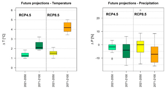 Projections for changes in precipitation are not as definite as for temperature, although the ensemble mean for all considered periods and concentration pathways indicate a decrease in future precipitation. For the near future period, the ensemble projections indicate an average decrease in precipitation of −2.2% (range: −11, +3) and −0.63% (−14, +26 (outlier); +9 (upper whisker)) for the RCP4.5 and RCP8.5, respectively. For the far future period, the ensemble projections indicate an average precipitation decrease of −4.6% (−15, +6) and −7.1% (−16, +3) for the RCP4.5 and RCP8.5, respectively. As indicated by the range of the projections, the ensemble of GCM–RCM combinations does not entirely agree on the direction of change: at least one model (far future; RCP8.5) and a maximum of nine model (near future; RCP8.5) projections indicate an increase in precipitation rather than a decrease, while four and five models for RCP4.5 (near) and RCP4.5 (far), respectively, indicate a positive increase. The uncertainty is larger for RCP8.5 than RCP4.5 for the near future. In general, the spread of the ensemble is larger for precipitation than for temperature.