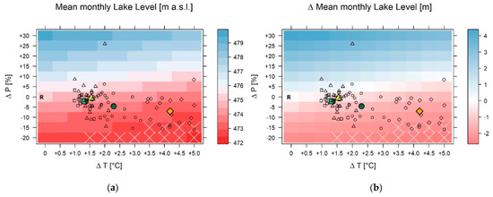 Response surfaces showing absolute (in m a.s.l., (a)) and relative (deviation from reference level, (b)) changes in the water level of Lake Malawi as simulated by the ULMBM and the LMM using systematically perturbed precipitation (y-axis) and temperature (x-axis) data as input. The points added to the response surface indicate the hydro-climatological change as projected by the 20 GCM–RCM combinations indicated in Table 2. The different symbols refer to different periods and scenarios (rectangles/circles: RCP4.5 near/far future; triangles/diamonds: RCP8.5 near/far future). The colored symbols reflect the mean of the climate model ensemble for the respective periods and scenarios (same color code as in Figure 7). Pixels marked by an “X” indicate combinations of ΔT and ΔP where outflow from Lake Malawi temporally ceases (i.e., lake level temporally falls below 470.8 m a.s.l.). R is the reference pixel (ΔT = 0; ΔP = 0).