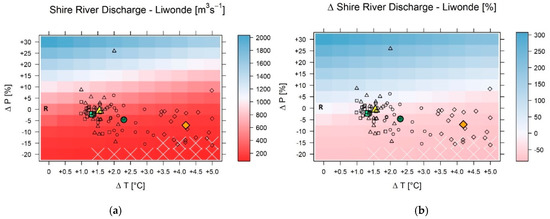 In terms of absolute river discharge, Figure 9a demonstrates that the mean annual discharge at Liwonde ranges from ~75 m3/s (ΔT +5 °C; ΔP −20%) to ~2000 m3/s (ΔT 0 °C; ΔP +30%). This refers to relative changes of −84% to +307%, respectively (Figure 9b). With increasing temperature (as a proxy for increasing evapotranspiration) and decreasing precipitation sums, river discharge in the Shire River decreases. As expected, the lowest discharge values are found for the combinations of lowest precipitation and highest temperature changes, while the largest discharge values are found for the opposite combination. Changes in river discharge are predominantly driven by scaling precipitation, although temperature also impacts the changes in discharge since the color changes in the plots (Figure 9) are not strictly horizontal but slightly diagonal. The effect of temperature scaling, however, is not as distinctive as for lake level changes (see Figure 8). As indicated by the mean of the climate projection ensembles (colored symbols, Figure 9), the reference (current) mean discharge of ~500 m3/s will likely decrease by/to −49%/253 m3/s (RCP4.5) and −23%/385 m3/s (RCP8.5) in the near future period, and by/to −59%/202 m3/s (RCP4.5) and −75%/127 m3/s (RCP8.5) in the far future period (Table 3). The large spread of the ensemble members, though, indicates that some individual cases project an increase in Shire River discharge. However, most of the ensemble members for every period and scenario considered indicate a decrease in discharge between −50% and −76% (interquartile range; i.e., 25%–75% of the ensemble distribution).