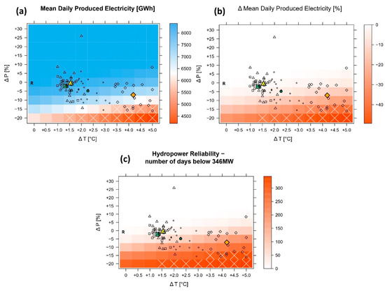 Figure 10 presents the response surfaces illustrating absolute (a; in GWh) and relative changes (b; in % differences from reference mean) in agglomerated mean hydropower production in the middle Shire River (in terms of mean daily produced electricity). Hydropower production is estimated based on discharge simulations derived by the hydrological model chain driven with systematically perturbed meteorological observation data as input. Hydropower reliability (Figure 10c) indicates the number of days with hydropower productivity below 346.3 MW (maximum production) per year.